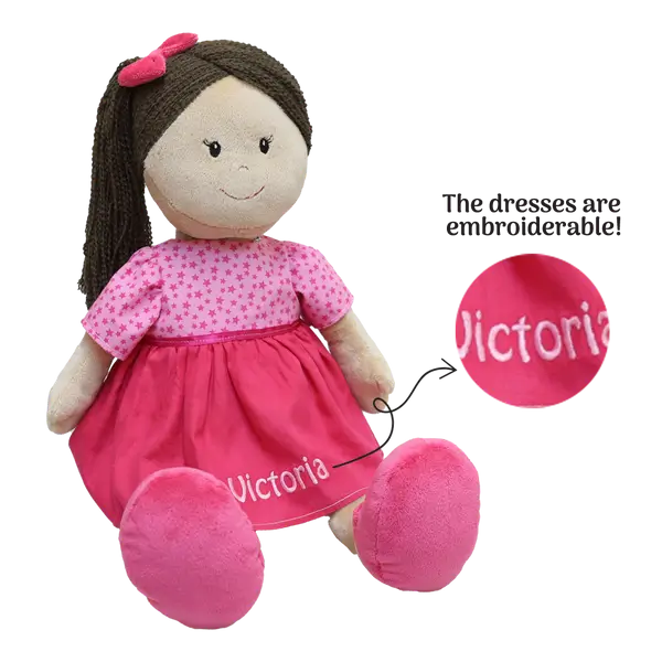 With her beautiful brown hair, cheerful pink dress, and ultra-soft plush feel, Cathy is designed for hugs, playtime adventures, and cozy bedtime routines. Her removable dress allows for beautiful custom embroidery, creating a one-of-a-kind keepsake families will treasure for years.